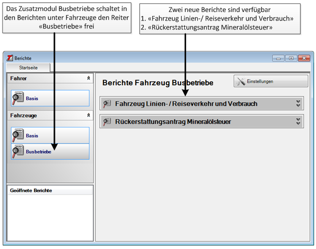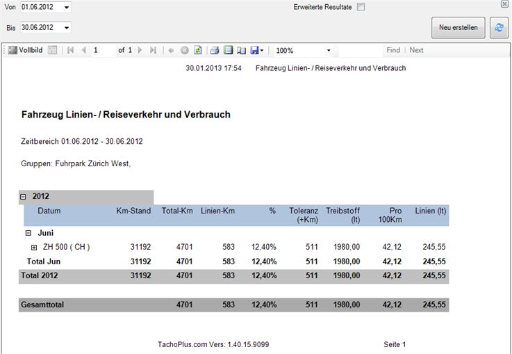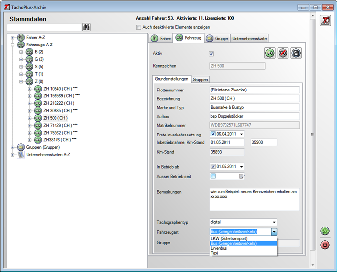 Einerseits ist dieses Modul in der Lage, eine monatliche Abrechnung der Kilometerleistung je Fahrzeug zu generieren. Sie sehen auf einen Blick, wie viele der gefahrenen Kilometer im Reiseverkehr und wie viele davon im Linienverkehr zurückgelegt wurden.