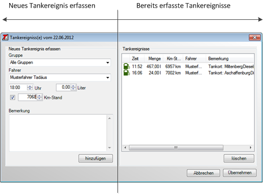 Zusätzlich kann erfasst werden, wann welcher Fahrer wie viel Kraftstoff getankt hat sowie Zusatzinformationen (z.B. Tankstellenpreise, Fahrzeuginformationen etc.) eintragen.