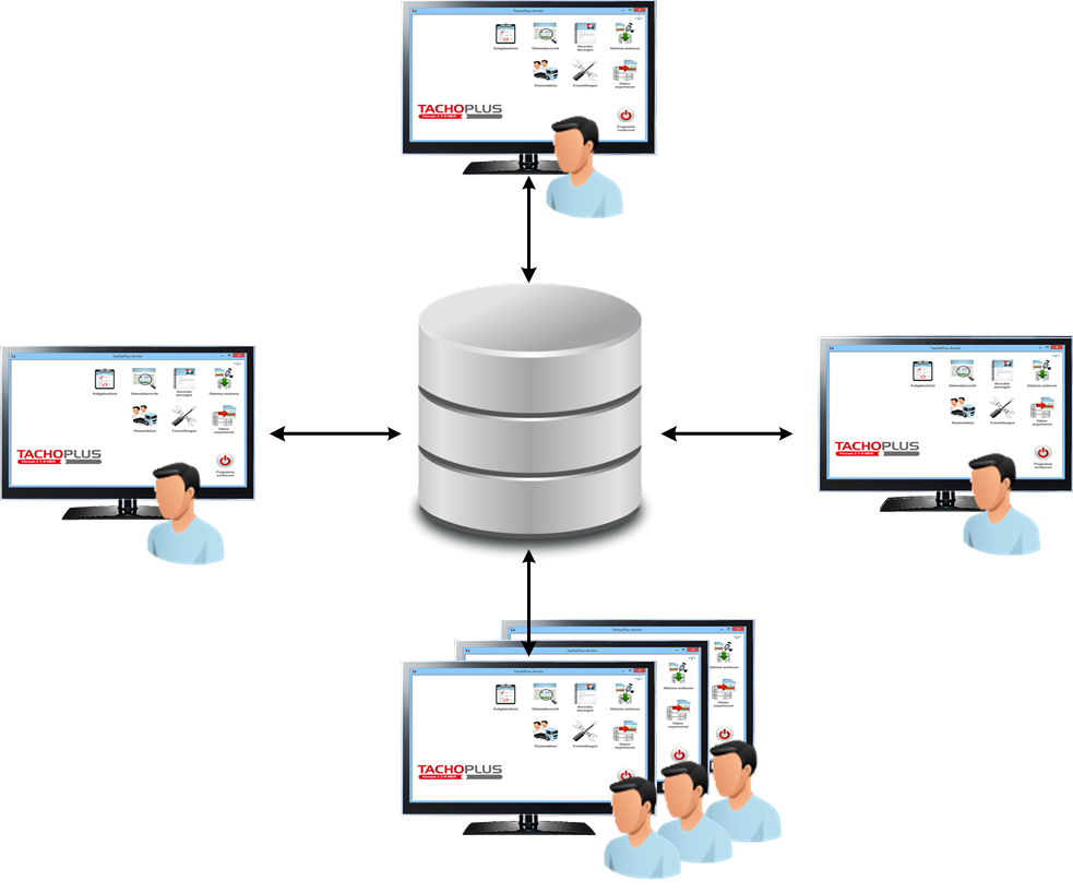 TachoPlus Enterprise lässt sich leicht in bestehende EDV-Strukturen einfügen: Eine zentrale Datenbank auf einem Server bindet über lokale Netzwerke oder standortübergreifend (LAN / WAN) mehrere Arbeitsplätze und Datenerfassungsgeräten.